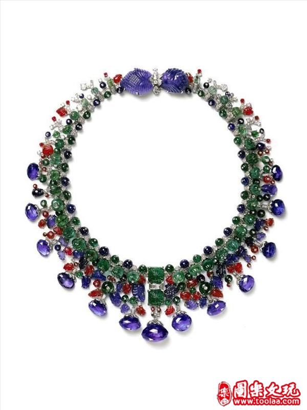 Cartier对坦桑石的设计往往简单粗暴:奢华多料,项链通体坦桑石珠串。