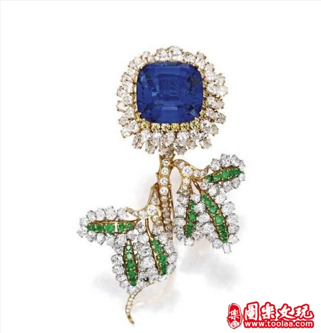 上图这枚古董珠宝胸针,就是1968年 Donald Claflin 专为 Tiffany & Co. 设计的作品。主石为一颗47.85克拉的枕形切割坦桑石,周围点缀有钻石、祖母绿。