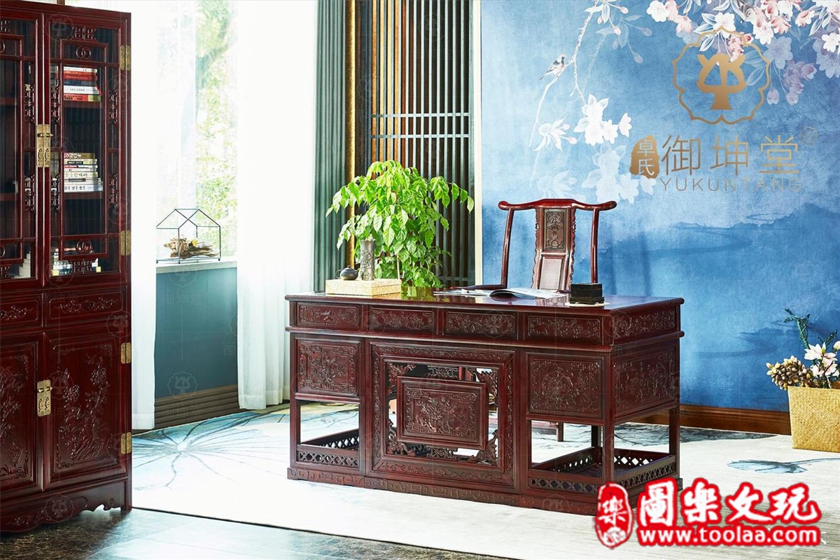 我办公室在用的就是一款红檀木制成的新中式办公桌,大家一起来看看: