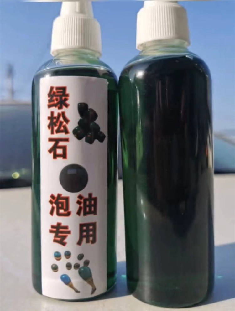 而现在的泡油绿松石我称之为“色拉油”,他会在精油的基础上混入提升颜色,拉高瓷度的材料,也就是在泡油的同时达到加瓷加色的目的,有了这种高科技材料的辅助,泡油绿松石的原材料要求就很低了,不论颜色瓷度品相都可以