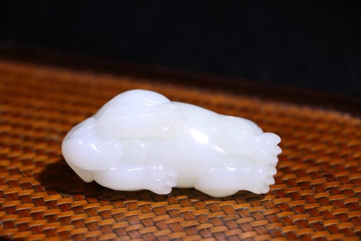 【招财貔貅】和田玉羊脂白玉带皮手把件,精工圆雕,形制规整霸气,威武雄浑,气韵非凡了得。福兽扭头回望,双目炯炯有神,灵性如生。雄浑威武,瑞气翻腾,神态威严霸气,睥睨天下。有扭转乾坤之势,揽八方之财, 载大德大仁, 天禄赐福,辟邪化煞,镇守乾坤,财富绵延。
