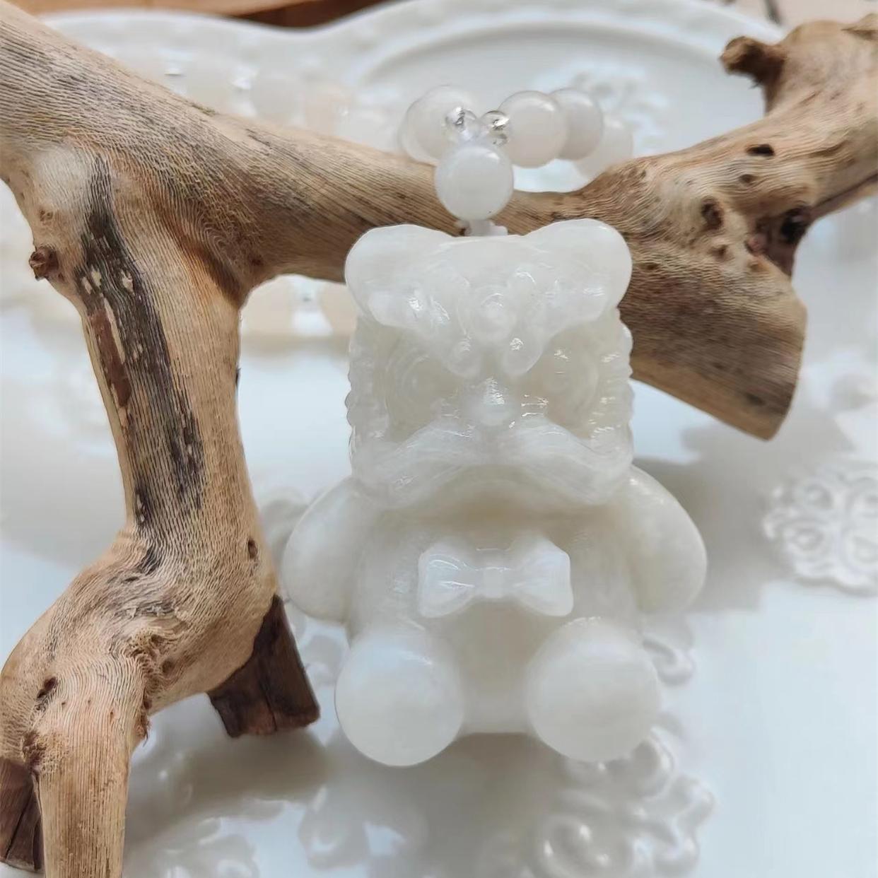 关于醒狮的材质,大部分商家买的都是佘太翠。佘太翠是一种产量很大的中低档玉石,价格不算贵,而且可以从粗糙的样子盘得通透水润,非常有成就感。