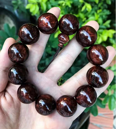 如下面这款1.5山水瘤花玻璃底的海黄手串,是海南八所紫油梨老料,紫红底内敛贵气,山水瘤花璀璨盛放,高油高密,迷人玻璃底材质,压手感十足,盘玩易包浆,个性潮玩,佩戴显品味。