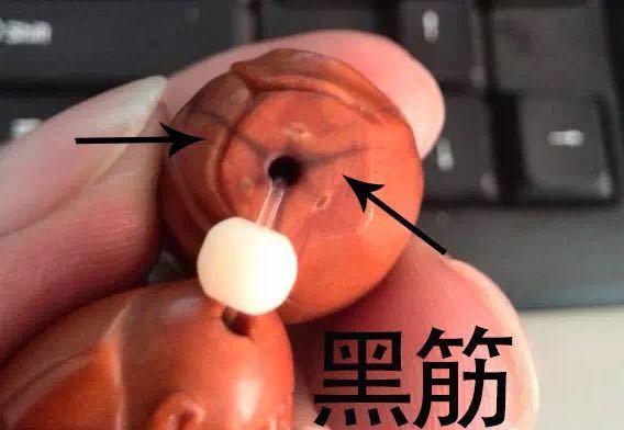 通过筋线的数目可以判断橄榄核的三花、四花,也可以通过筋线的颜色来判断橄榄核的核质。油核的筋线一般偏深红、偏黑,铁核的筋线偏黄,颜色更接近橄榄核本身的颜色。这也是判断油核、铁核的方法,但也并非绝对的。