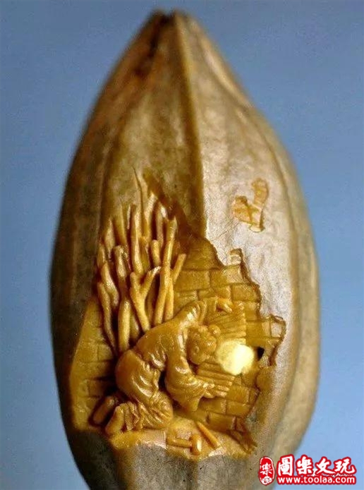 例如下面著名雕刻师【秋人】的作品《凿壁借光》。巧妙的利用夹生那一块与周围在颜色上的差异,将夹生部分衬托成墙洞里透出的灯光,设计之巧妙让人触目兴叹。