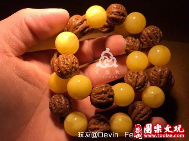 这时候你也就没有必要介意别人的眼光了,只要按照自己的想法装饰自己的手串就好了,就像玩友这条京八棱和蜜蜡搭配在一起的手串,核桃和蜜蜡交相辉映,缺一不可,新奇别致,这也是新的玩法。