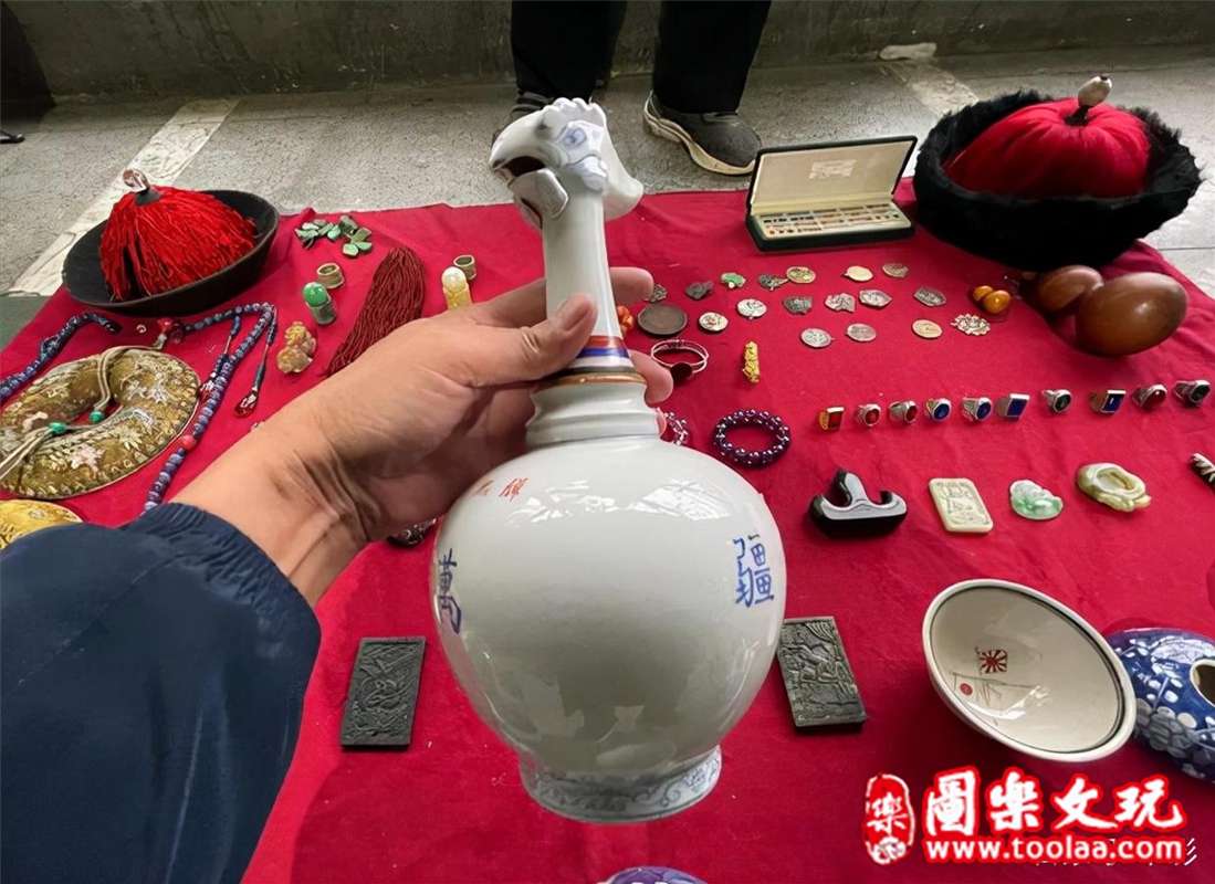 这个是外地老人摆摊,这个酒瓶要1800元,说是伪满洲国皇宫用的,他还有两样相似的东西,但我没有要。
