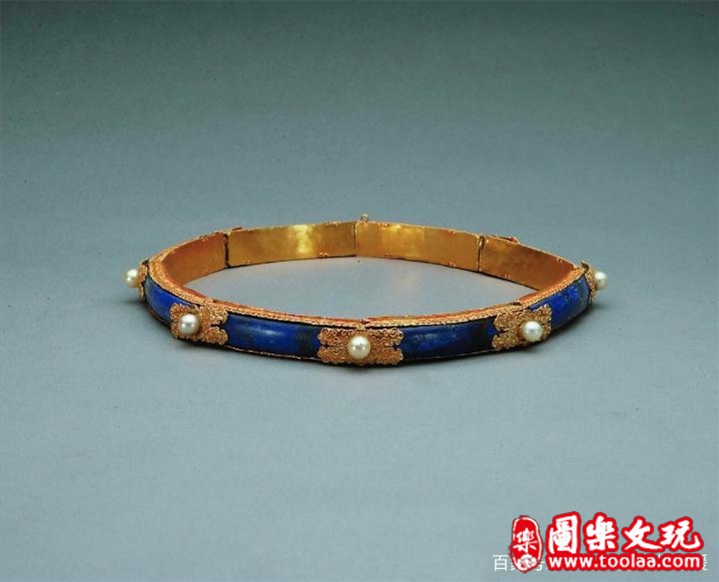 这款收藏在故宫的清代金镶青金石领约,周长46厘米,直径22厘米。领约又称为项圈,是清代后妃用于约束颈间衣领的装饰物。此领约为环形活口开合式,活口处的纹样是金质錾花云蝠纹。环上对称镶嵌青金石四块,红矿石两块。镶嵌红宝石两颗,蓝宝石两颗,珍珠一粒。