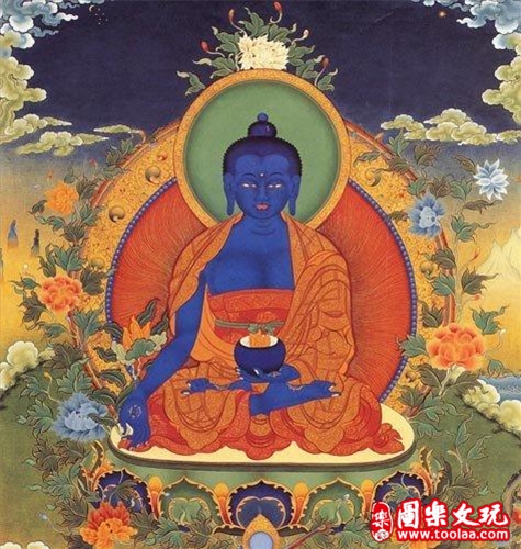 在佛教中,青金石的地位也是不俗,它被称为吠努离或璧琉璃,属于佛教七宝之一。青金石的蓝色为药师佛的身色,象征着药师佛的慈悲,能够减轻病人的痛苦。工匠们把青金石打磨成粉,溶在溶液中,像作油画一样,涂抹在唐卡、墙壁或者雕塑白体上。莫高窟的壁画上,飞天的衣饰随风而起就是用的青金石颜料。